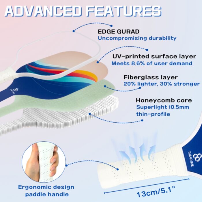 š¹ Fiberglass paddles with honeycomb polymer core for enhanced durability and consistent play, providing both power and control.
