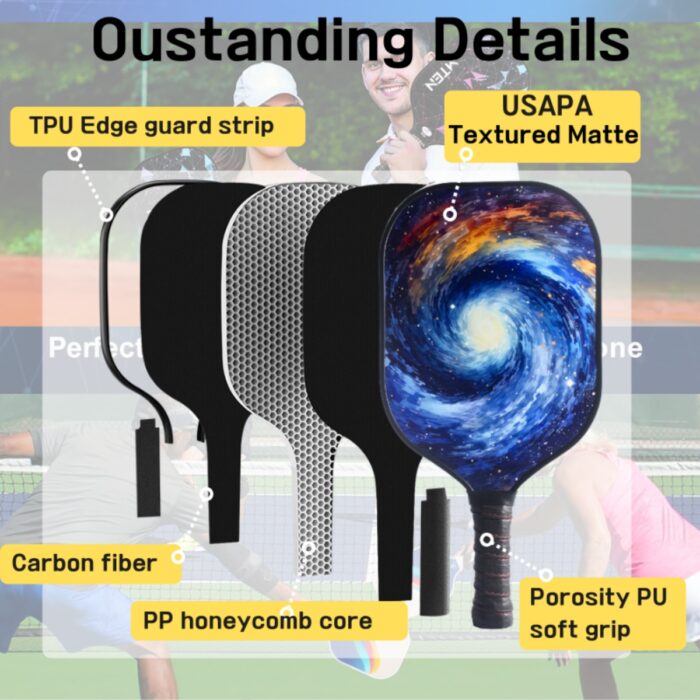 Step into the court with confidence using the Soft Grip Thermoformed Racket, a next-generation pickleball paddle meticulously designed for players who demand control, power, and durability in every swing. Crafted with T700 carbon fiber, this racket delivers unmatched resilience and precision shot placement, while its thermoformed construction ensures consistency and stability even during intense rallies. The 16mm thick honeycomb core absorbs vibration efficiently, giving you a comfortable yet explosive feel that transforms your game. The sleek, fashionable design not only enhances your style on the court but also represents the essence of modern performance engineering.